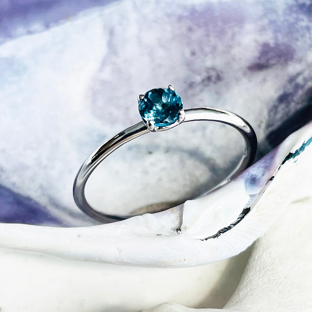 The traditional raised four claw design brings a romantic aura, while the oceanic depths of London blue topaz create a window to your soul. The design elevates the azure gemstone to the light, enhancing its incredible sparkle. This gorgeous piece is destined to be the focal point of any ring stack.