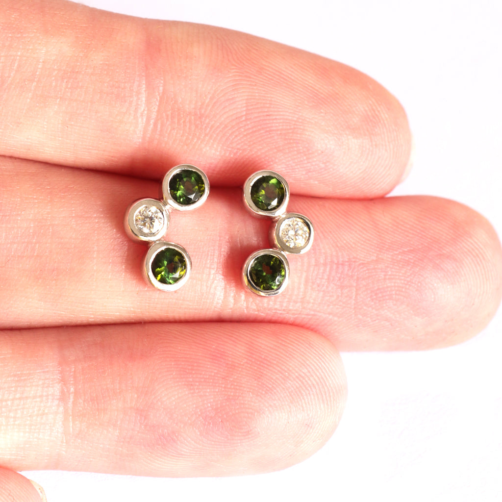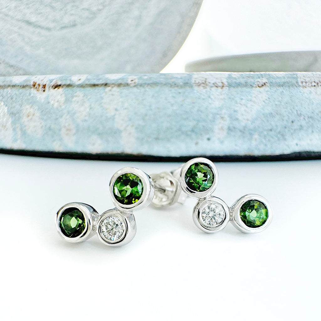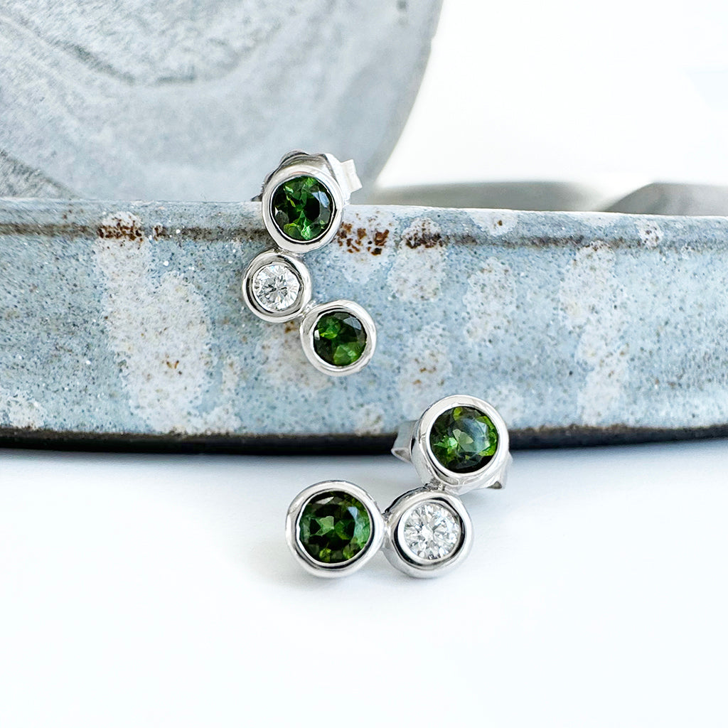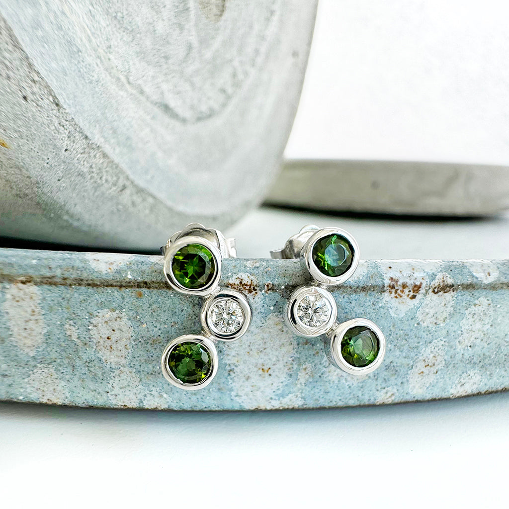 White Gold Round Drop Green Tourmaline and Diamond Earrings