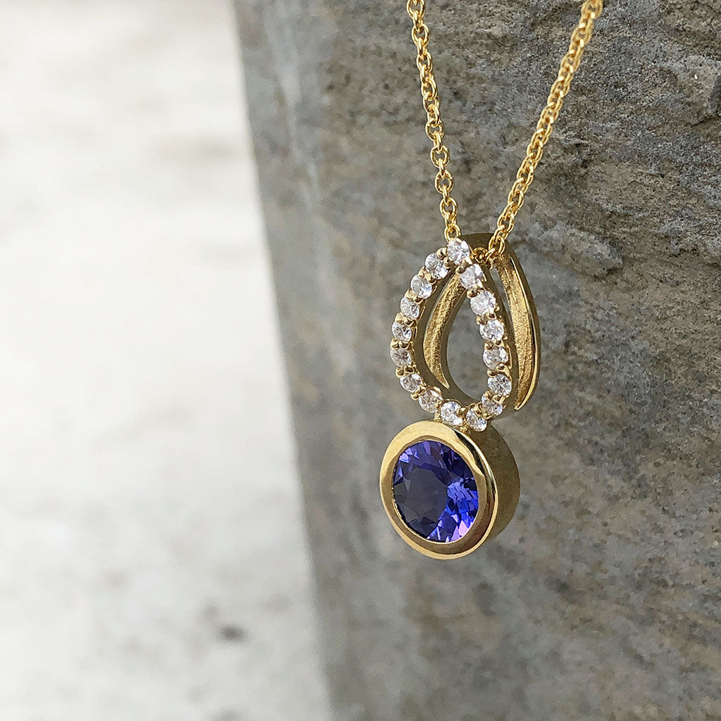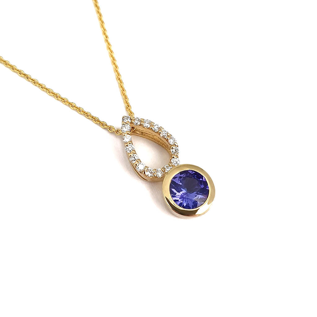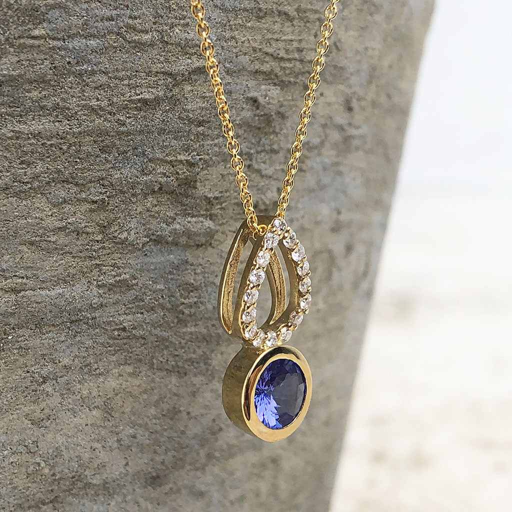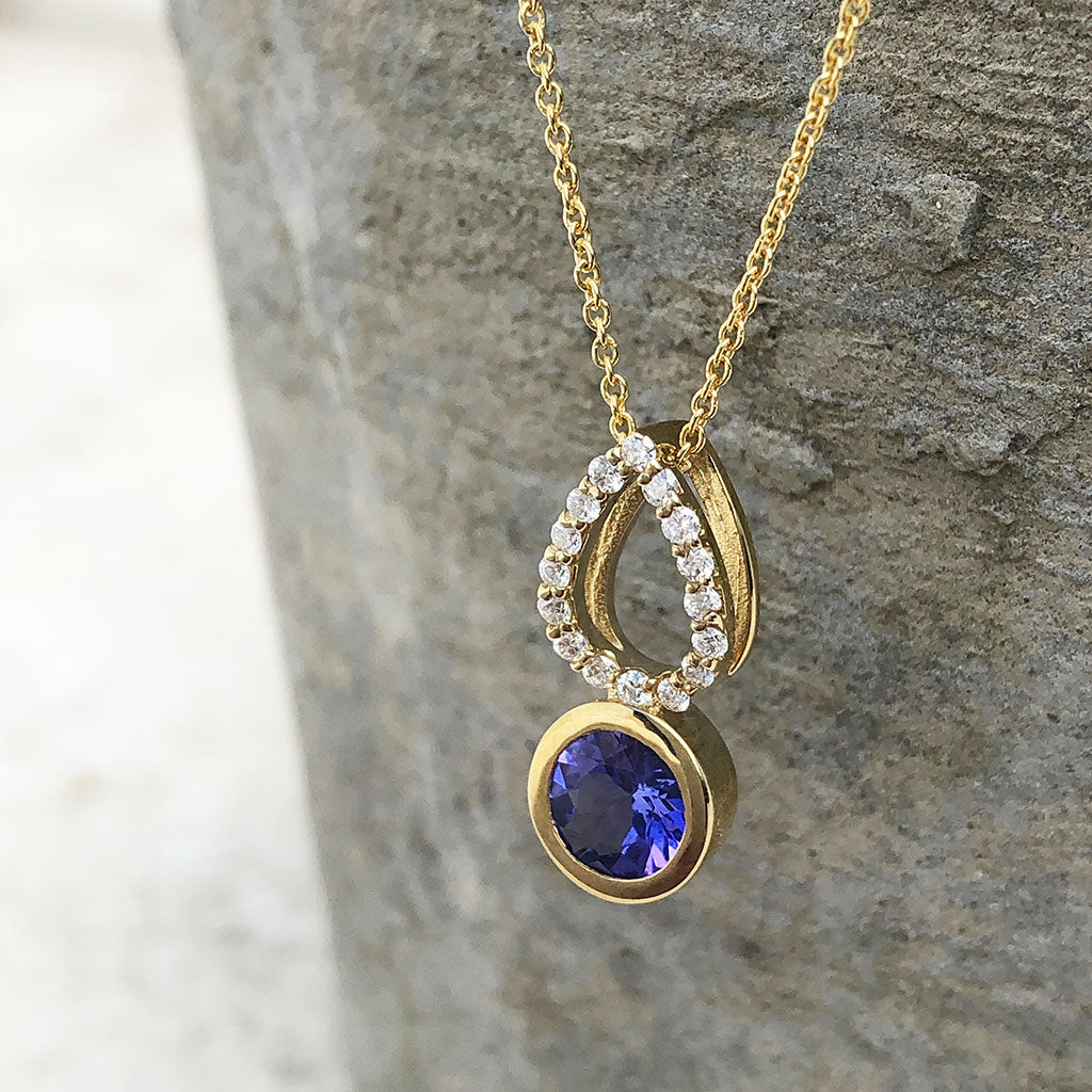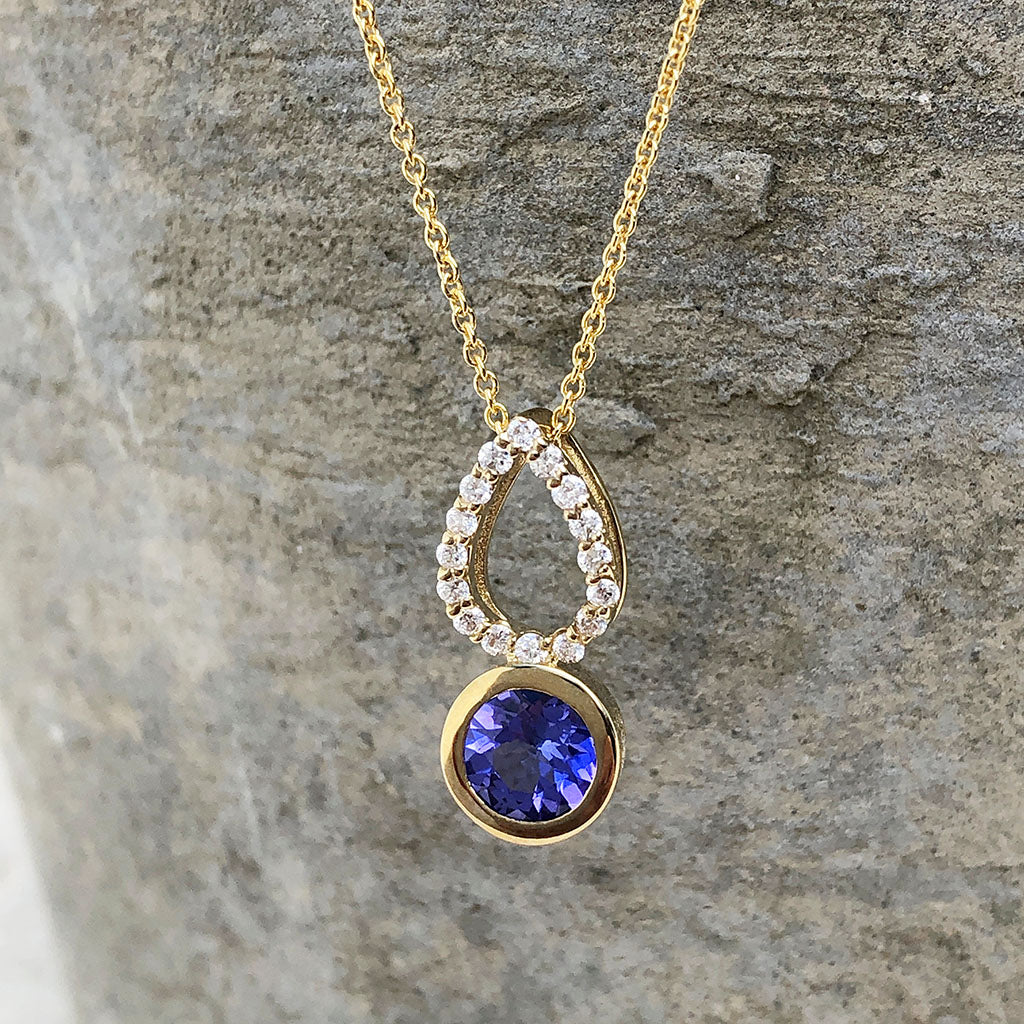 Yellow Gold Diamond Pave droplet and Tanzanite Pendant