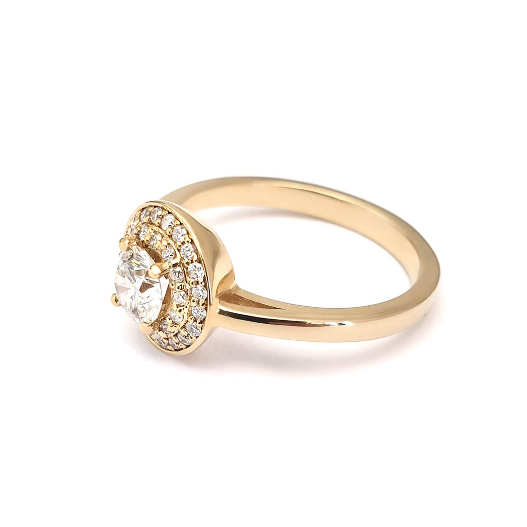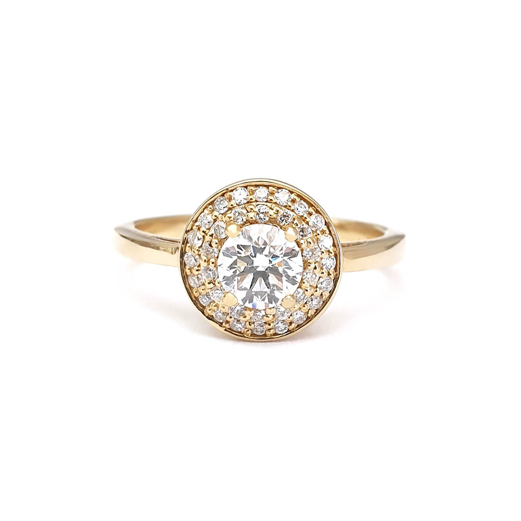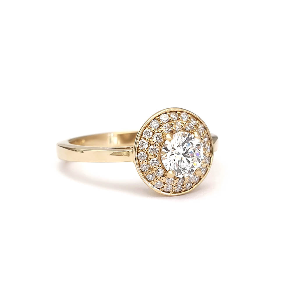 This sparkling ring features a brilliant round cut white diamond at its center surrounded by a double halo of gleaming smaller diamonds. The setting is crafted in gleaming 18-carat yellow gold; the perfect contrast to the scintillating diamonds. This is true classic glamour.