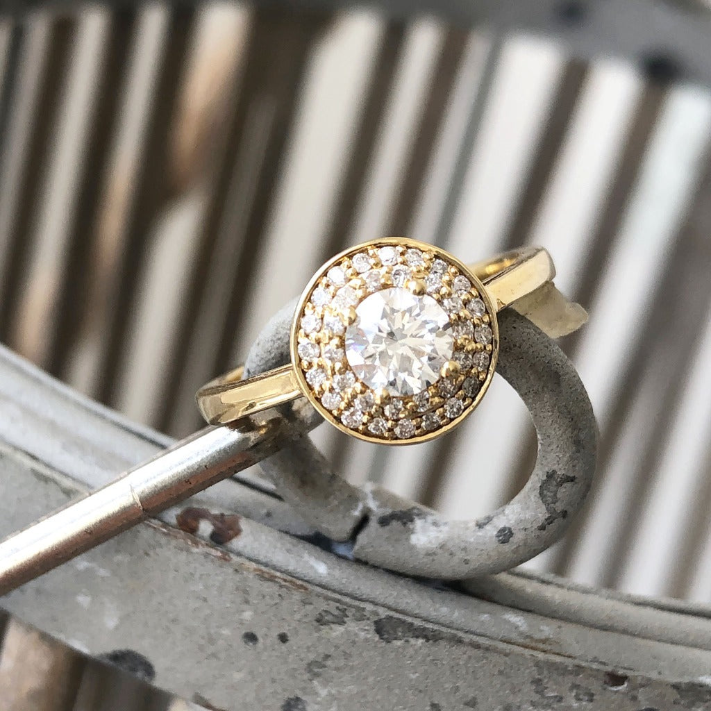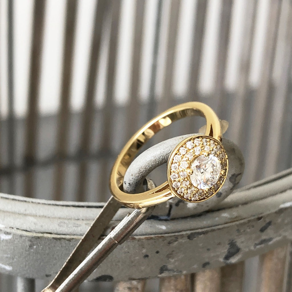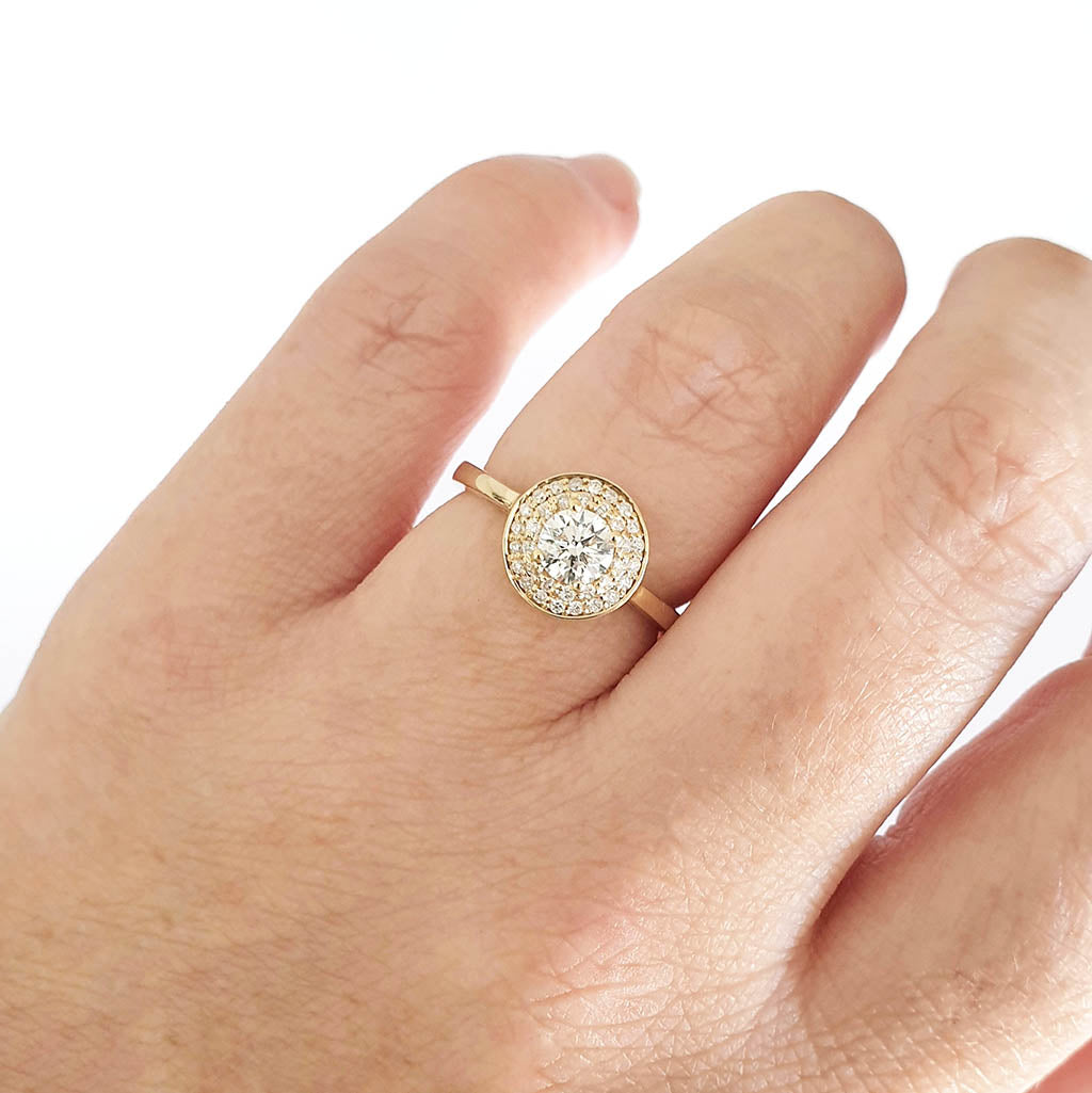 This sparkling ring features a brilliant round cut white diamond at its center surrounded by a double halo of gleaming smaller diamonds. The setting is crafted in gleaming 18-carat yellow gold; the perfect contrast to the scintillating diamonds. This is true classic glamour.