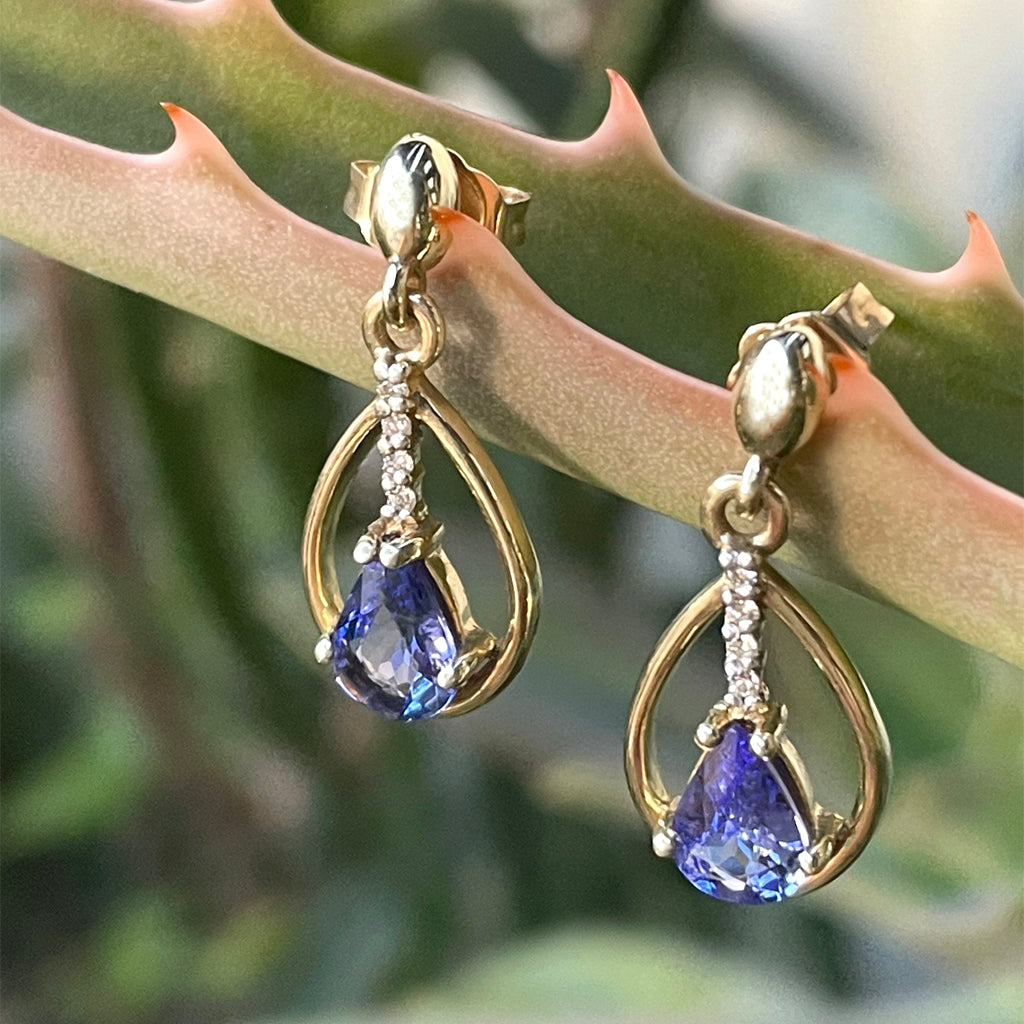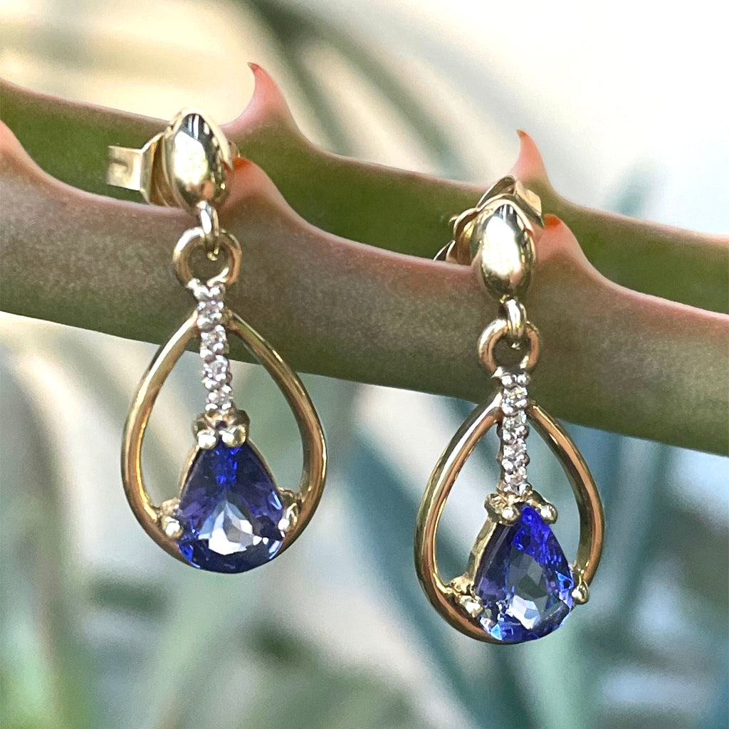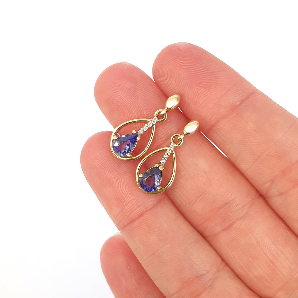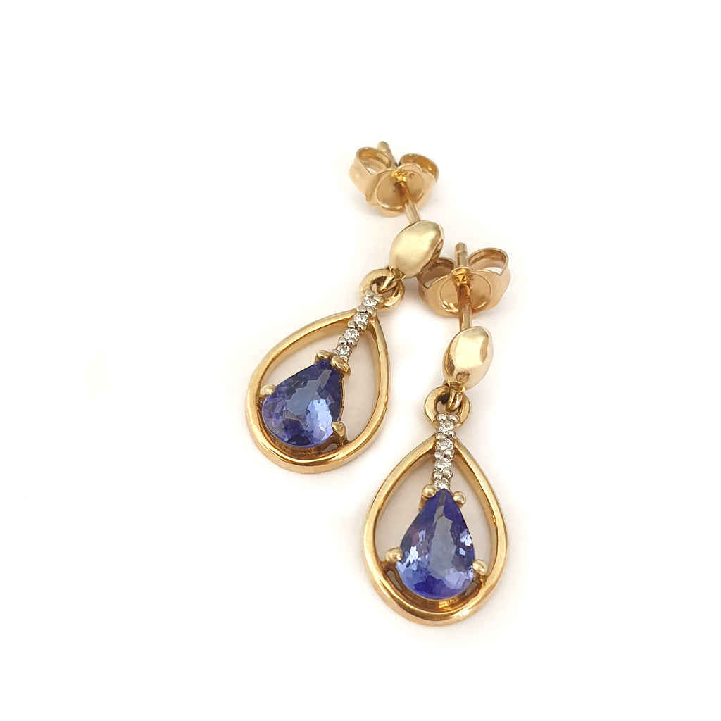 Yellow Gold Pear Cut Tanzanite Earrings with Diamond Strip Highlight