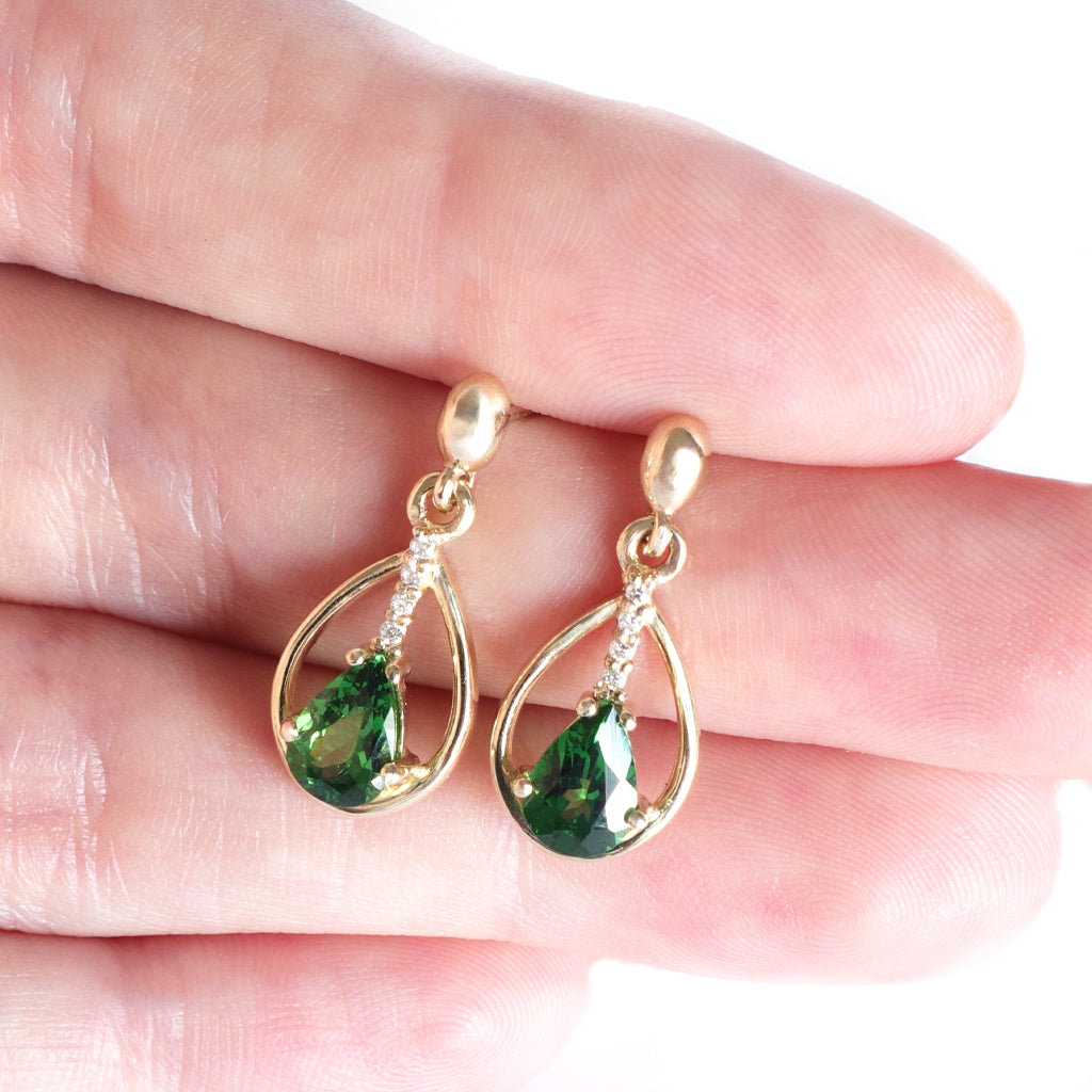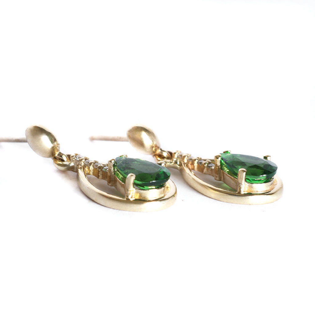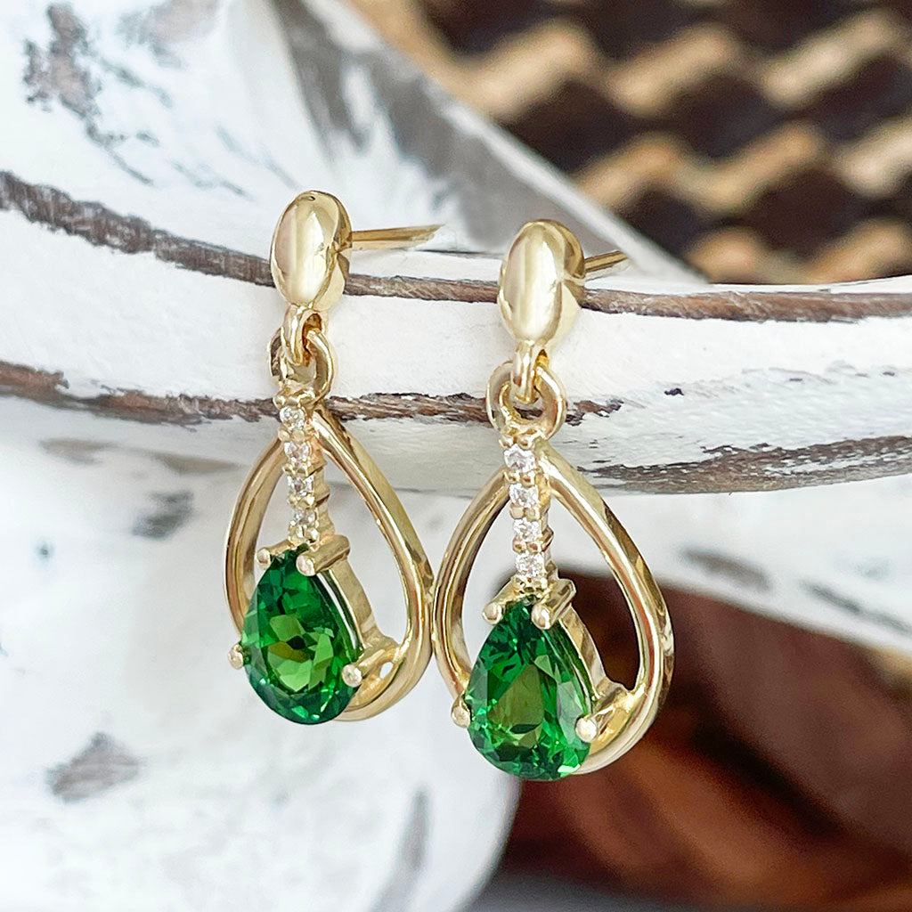 Yellow Gold Pear Cut Tsavorite Earrings with Diamond Strip Highlight