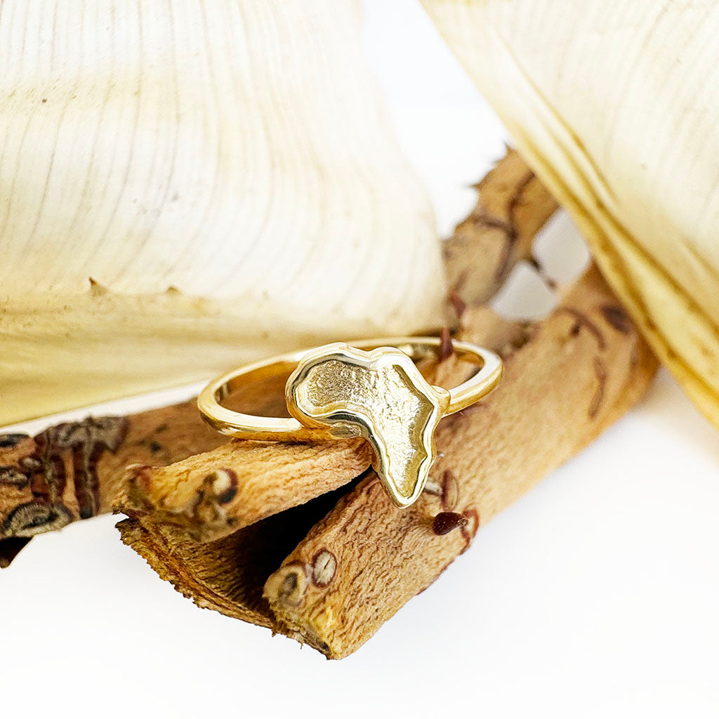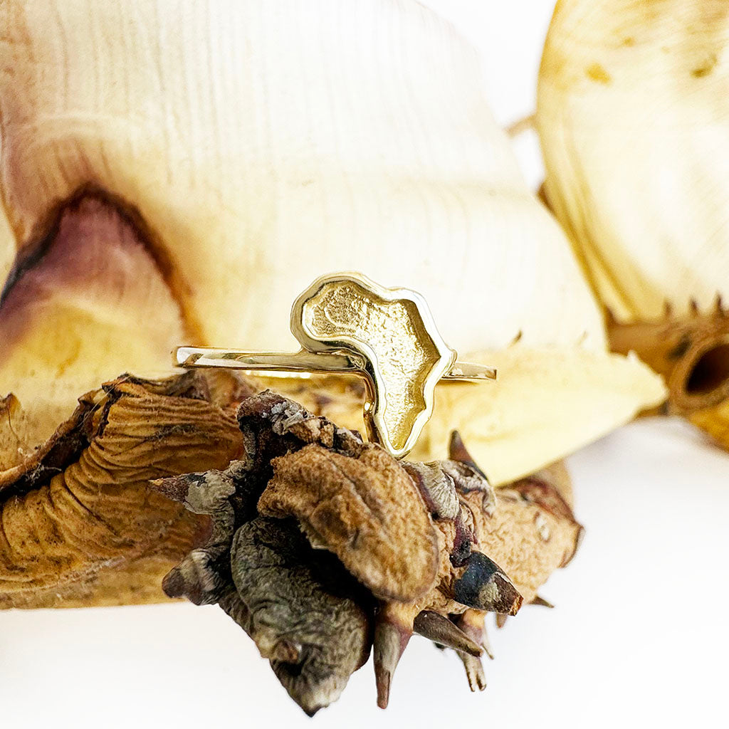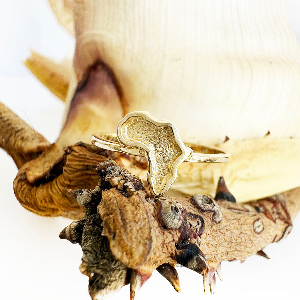 Yellow Gold Sandblasted Africa Map Ring with Striking Smooth Gold Border and Band